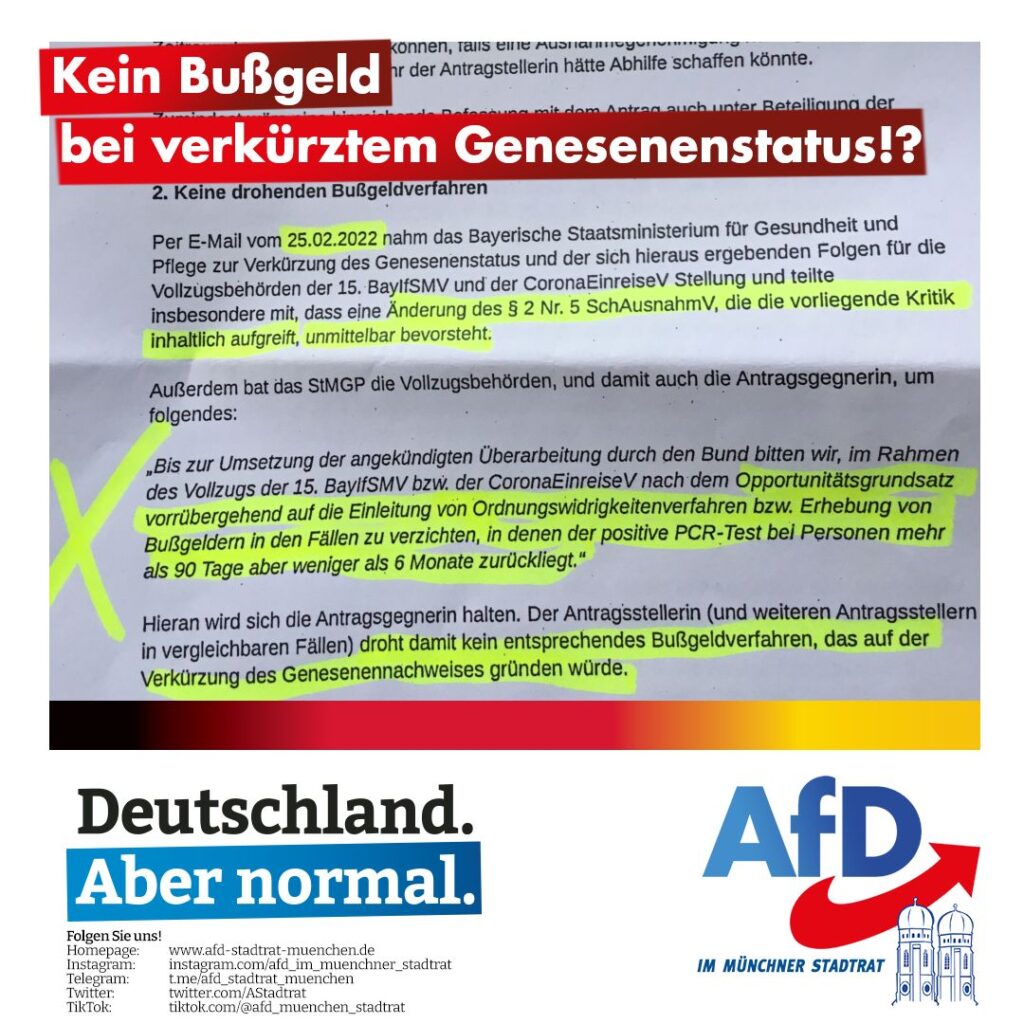 Im Rahmen eines Eilverfahrens wegen des verkürzten Genesenenstatus vor dem Verwaltungsgericht München teilte das Gesundheitsreferat u. a. mit, dass die Vollzugsbehörden seit dem 25.02.2022 keine Bußgelder bei Personen erheben, deren […]