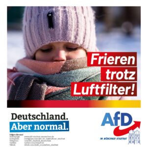 Schon Ende letzten Jahres hatte die Landeshauptstadt beschlossen, Münchner Grundschulen mit Luftfiltern auszustatten. Nun werden Eltern in Rundschreiben dazu aufgefordert, ihre Kinder dennoch warm anzuziehen und mit Decken auszustatten, weil trotz der Luftfilter gelüftet werden müsse. Fast ist es wie mit der Impfung. Man hat sie zwar, aber es löst das Problem nicht. Hier wurde wohl wieder zwecklos Geld ausgegeben. Es ist absolut unverständlich, warum in einem angeblich so reichen Land wie Deutschland Kinder in der Schule frieren müssen.