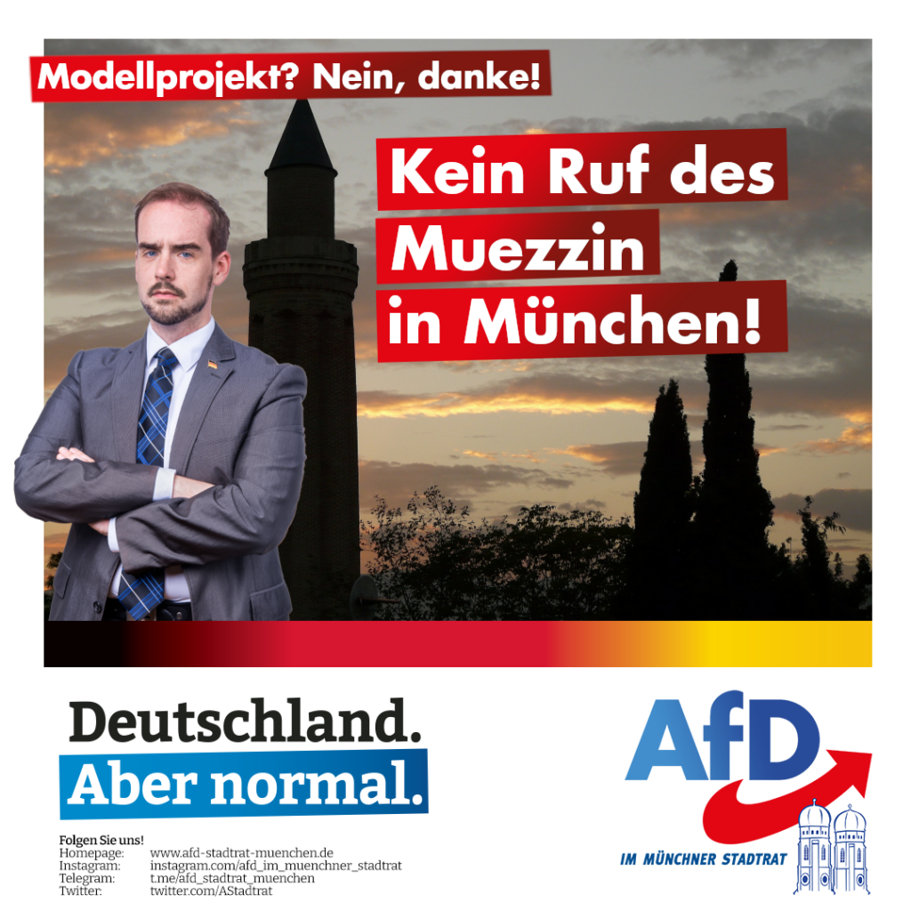 Für die AfD-Stadtratsgruppe ist das Ansinnen des Oberbürgermeisters vollkommen indiskutabel. Der ehrenamtliche Stadtrat Markus Walbrunn erklärt hierzu: „Der Ruf des Muezzin ist nicht, wie allzu oft suggeriert, dem Kirchengeläut gleichzusetzen. Er enthält eine klare missionarische Botschaft und ist folglich inkompatibel zur religiösen Pluralität in unserem Land sowie eine Zumutung für alle Nichtmuslime!“