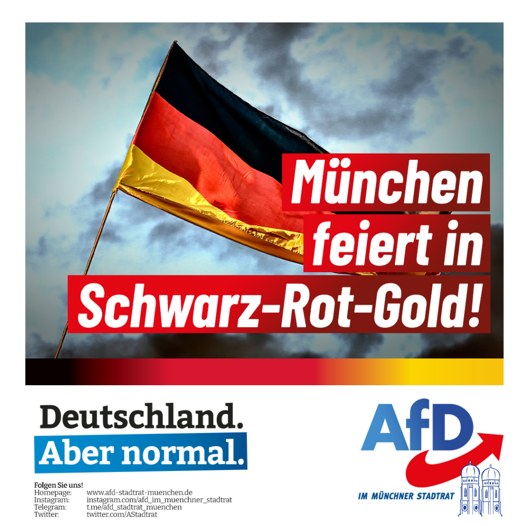 Wir haben als AfD-Gruppe im Münchner Stadtrat einen Antrag eingebracht, in dem wir die schwarz-rot-goldene Beflaggung Münchens zum 3. Oktober anlässlich des Tags der Deutschen Einheit fordern. Anders als in anderen Ländern der Welt begehen wir unseren Nationalfeiertag in einem kaum nennenswerten feierlichen Rahmen. Dies ist bedauerlich, könnte doch gerade in Zeiten einer zunehmenden Polarisierung zwischen den politischen Lagern und gesellschaftlichen Gruppen, die Betonung der gemeinsamen nationalen Identität ein verbindendes Band darstellen. Wir fordern daher die Landeshauptstadt auf, als gutes Beispiel voranzugehen und auch mit Flaggen an den Fahrzeugen der Münchner Verkehrsgesellschaft ein Zeichen für die Einigkeit Deutschlands zu setzen.
