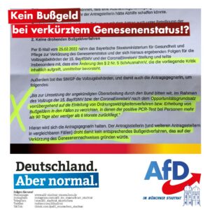 Im Rahmen eines Eilverfahrens wegen des verkürzten Genesenenstatus vor dem Verwaltungsgericht München teilte das Gesundheitsreferat u. a. mit, dass die Vollzugsbehörden seit dem 25.02.2022 keine Bußgelder bei Personen erheben, deren Genesung länger als drei Monate aber noch keine sechs Monate her ist – sofern der Bundesgesetzgeber nicht noch etwas anderes beschließt.
