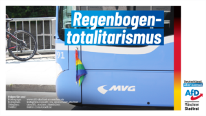 Hinzu kommt: die im aktuellen Beispiel benannten Regenbogenfahnen an Bussen oder Trambahnen haben selbstverständlich das Ziel, vermeintliche Vorbehalte z.B. gegen Homosexuelle abzubauen. Unabhängig davon, wie verbreitet diese in München überhaupt sind, wird jedoch niemand seine Einstellung aufgrund solcher Fähnchen ändern. Im Gegenteil besteht die Gefahr, dass (nicht nur) diese Maßnahmen als aufdringlich und indoktrinierend wahrgenommen werden, und somit überhaupt erst zur Ablehnung anderer, von der eigenen abweichenden, Neigungen beitragen.