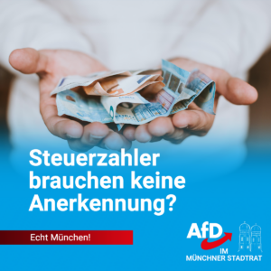 Oberbürgermeister Reiter hält Ehrungen von Steuerzahler für Geldverschwendung. Im Hinblick auf den Steuerzahlergedenktag, der symbolisch den Tag markiert, an dem der Schaffende für sich selbst und nicht mehr für den Staat arbeitet, stellte die AfD-Stadtratsgruppe den Antrag, Münchner Steuerzahler für ihren Einsatz entsprechend zu ehren. Hierzu sollte die Verwaltung ein Konzept entwickeln, das auch bloß eine kostenlose Lösung wie eine Danksagung durch den Oberbürgermeister hätte umfassen können.