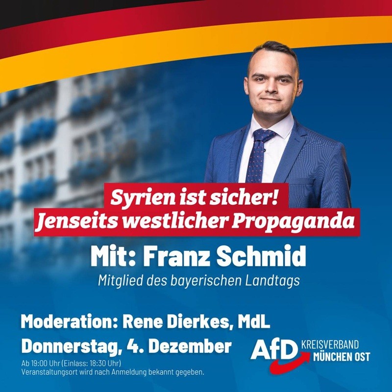 Der Landtagsabgeordnete Franz Schmid wird einen spannenden Vortrag zu seiner vor wenigen Wochen erfolgten Reise nach Syrien halten. Mehr als eine Millionen syrische Flüchtlinge kamen seit 2015 nach Deutschland. Als Grund wurde der frühere Machthaber Assad benannt. Dieser ist nun weg. Wie ist inzwischen die Lage in Syrien? Können Rückführungen erfolgen? Antworten darauf erhalten Sie auf diesem Infoabend des AfD-Kreisverbands München-Ost.