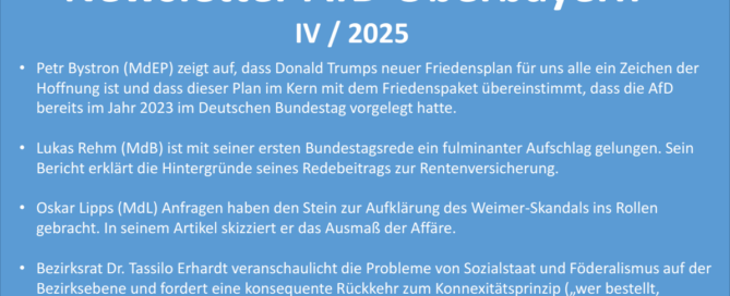 In unserem letzten Rundbrief dieses Jahres dürfen wir Sie wieder über die aktuelle Arbeit unserer oberbayerischen Mandatsträger informieren. Der Block der Altparteien will die AfD in den Parlamenten isolieren und von politischer Teilhabe ausschließen. Schon jetzt sehen wir: Dieser Plan geht nicht auf. Auch wenn wir noch nicht in Regierungsverantwortung sind, bringt unsere parlamentarische Arbeit bereits jetzt viele gute Früchte. Die Beiträge dieses Rundbriefs (siehe PDF-Anhang) berichten Ihnen von den positiven Entwicklungen, die wir anstoßen. – Für eine optimale Wiedergabe schalten Sie in Ihrem E-Mail-Programm bitte die Anzeige von Bildern ein: